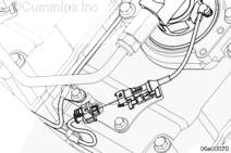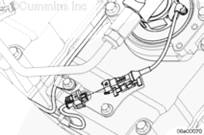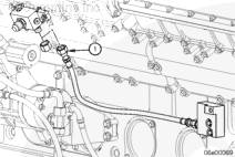 注: 如果發(fā)動(dòng)機配備 CM2150 ECM (1),用一塊不起毛的布蓋住螺塞。將高壓燃油管最后一個(gè)噴油器的螺塞松開(kāi) 1/4 至 1/2 圈。不必拆下螺塞以釋放壓力。連接 INSITE ™ 服務(wù)軟件,然后通過(guò)監測燃油油軌壓力核實(shí)燃油壓力已下降。