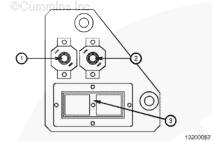 康明斯電子控制船用發(fā)動(dòng)機配備了 2 個(gè)斷路器,位于發(fā)動(dòng)機的 ECM 側。5 安斷路器 (1) 用于鑰匙開(kāi)關(guān)控制的 ECM 電源,10 安斷路器 (2) 用于非鑰匙開(kāi)關(guān)控制的面板電源。電路斷路器板上還安裝有 40-針 OEM 接頭(3)。
