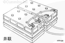 插圖所示為一種典型的蓄電池并聯(lián)連接。這種連接使發(fā)動(dòng)機得到雙倍的起動(dòng)電流。