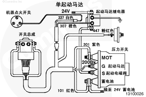 只有 L10/M11/N14/K19/QSK19/QST30/V28 發(fā)動(dòng)機需要一個(gè)起動(dòng)馬達。參考單起動(dòng)馬達電氣接線(xiàn)圖。