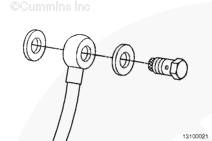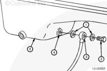 把一個(gè)銅密封墊圈 (1) 放在空心螺栓上 (2)。把空心螺栓插到空心管接頭內 (3)。將其他銅密封墊圈 (1) 放到空心螺栓/空心管接頭總成中。將空心螺栓/空心管接頭總成插入到油底殼 (5) 的回油側 (4)。扭矩值: 88 n.m [65 ft-lb]