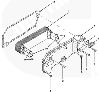 1六角頭螺栓 - 12 - M10 x 1.50 x 30,2六角頭螺栓 - 6 - M10 x 1.50 x 75,3六角頭螺栓 - 1 - M10 x 1.50 x 65,4六角頭螺栓 - 1 - M10 x 1.50 x 20,5蓋板 – 1,6 O 形密封圈 – 1,7機油冷卻器蓋 – 1,8六角凸緣螺母 – 4,9機油冷卻器雙頭螺柱 O 形密封圈 – 4,10機油道 O 形密封圈 – 2,11冷卻器芯 – 1,12機油冷卻器蓋密封墊 - 1。
