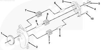 1機油泵驅動(dòng)齒輪,2機油泵泵體,3機油泵蓋,4襯套,5 O 形密封圈,6機油泵從動(dòng)齒輪軸,7機油泵驅動(dòng)齒輪,8機油泵主驅動(dòng)齒輪,9機油泵主驅動(dòng)軸,10六角頭螺栓 (5) - M8 x 1.25 x 20。