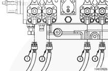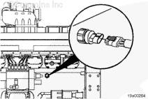 從發(fā)動(dòng)機線(xiàn)束上拆下全部 P 形夾和線(xiàn)束固定支架,然后拆卸線(xiàn)束。使用一把 4 mm [5/32 in] 六角扳手從 ECM 上斷開(kāi)發(fā)動(dòng)機線(xiàn)束 Deutsch 接頭。