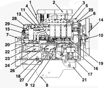 1渦輪增壓器進(jìn)口接頭,2 ATA 跨接接頭,3組合式機油濾清器,4高壓燃油管,5冷卻液出口接頭,6吊耳,7飛輪殼,8放油口,9右排燃油泵,10風(fēng)扇皮帶惰輪總成,11燃油進(jìn)口管接頭,12加油管,13燃油供應泵殼,14風(fēng)扇輪轂,15燃油濾清器,16冷卻液添加劑,17冷卻液泵,18燃油切斷閥 2(右排),19進(jìn)氣歧管壓力傳感器 2(右排),20進(jìn)氣歧管溫度傳感器 2(右排),21冷卻液進(jìn)口接頭,22機油輸送管,23 Centinel 驅動(dòng)器接頭,24 Centinel 油箱油位開(kāi)關(guān)接頭,25充電機,26溢流閥,27燃油出口管接頭,28供油壓力傳感器,29供油溫度傳感器,