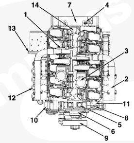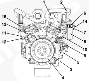 1渦輪增壓器排氣接頭,2 ATA 跨接接頭,3組合式機油濾清器,4中冷器殼/進(jìn)氣歧管,5曲軸箱通風(fēng)裝置,6風(fēng)扇皮帶惰輪總成,7風(fēng)扇輪轂,8燃油濾清器,9冷卻液添加劑,10進(jìn)氣歧管壓力傳感器 2(右排),11進(jìn)氣歧管壓力傳感器 1(左排),12冷卻液進(jìn)口接頭,13充電機,14燃油進(jìn)口管接頭,15減振器。