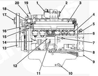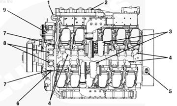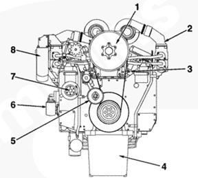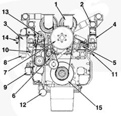 1渦輪增壓器進(jìn)口接頭,2 ATA 跨接接頭,3排氣口接頭,4發(fā)動(dòng)機轉速傳感器,5冷卻液出口接頭,6前吊耳,7飛輪殼,8曲軸箱通風(fēng)裝置,9風(fēng)扇輪轂,10充電機,11冷卻液液位開(kāi)關(guān)接頭,12組合式機油濾清器,13燃油進(jìn)口管接頭,14后吊耳。