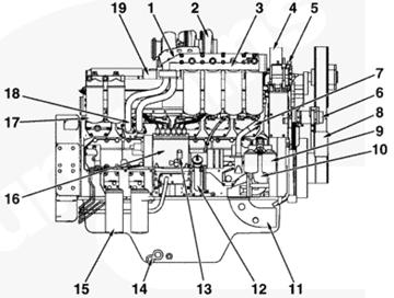 1空氣跨接殼體,2渦輪增壓器,3全流式機油濾清器,4出水口接頭,5吊耳,6風(fēng)扇皮帶惰輪總成,7水旁通管,8風(fēng)扇皮帶惰輪皮帶輪,9水濾器,10水泵,11進(jìn)水口接頭,12機油加注管,13輸油泵,14放油口,15燃油濾清器,16燃油泵,17機油旁通濾清器,18機油輸送管,19進(jìn)氣歧管。