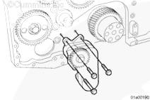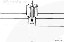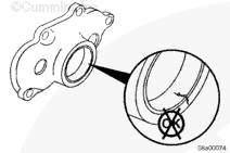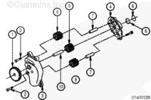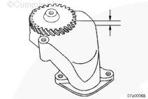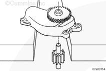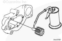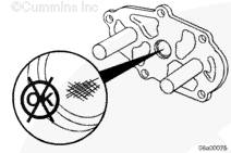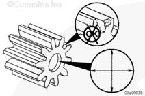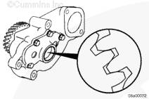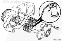 通過(guò)緩慢轉動(dòng)驅動(dòng)齒輪和檢查泵齒輪是否損壞來(lái)檢查機油泵能否繼續使用。如果機油泵內有零件損壞,則此泵必須大修或更換。有關(guān)大修的詳細信息,請參考《 QST30 大修手冊》(公告號 3666190)中的第 7 節。