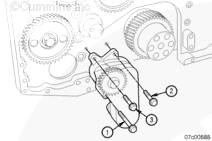 注: 檢查 O 形圈有無(wú)刻痕或切口,確保 O 形圈在凹槽中沒(méi)有扭曲。使用 Lubriplate™ 105 馬達組裝潤滑脂或等同物潤滑 O 形圈和機油泵凹槽。將一個(gè) O 形圈安裝到機油泵的凹槽中。潤滑脂將使 O 形圈固定在凹槽中。將機油泵安裝到缸體上。將一個(gè)長(cháng)螺栓 (1) 和兩個(gè)短螺栓(2、3)安裝到機油泵中。擰緊所有螺栓。
