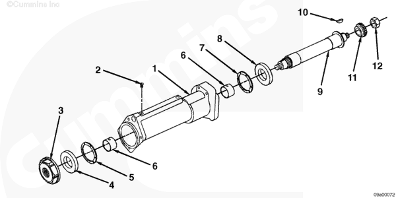 1驅動(dòng)殼體,2直螺紋 O 形圈螺塞 (3),3螺母,4止推板(小內徑),5止推軸承,6襯套 (2),7止推軸承,8止推板(大內徑),9傳動(dòng)軸,10半圓鍵(參考注釋?zhuān)?1花鍵接頭,12螺母。