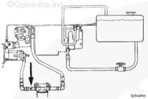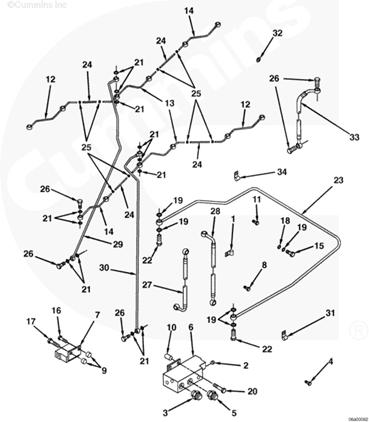 1左排歧管(零件號 3094772),2流至 EHAB 進(jìn)口(左排供油)的燃油(抽吸未經(jīng)過(guò)濾的燃油),3流至右排燃油歧管(右排供油)的燃油(抽吸未經(jīng)過(guò)濾的燃油),4自油箱/粗濾器的供油(抽吸未經(jīng)過(guò)濾的燃油),5自右排燃油歧管(右排回油)流入的燃油,6流至供油箱的燃油(回油),7自左排 EHAB/噴油泵溢流管和噴油器回油管(兩條管路)的回油。