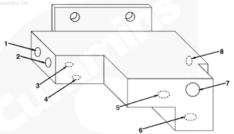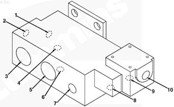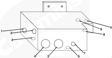 1左排燃油歧管(零件號 3094773),2流至濾清器進(jìn)口的燃油(未經(jīng)過(guò)濾的增壓燃油)。3自燃油濾清器出口的燃油(經(jīng)過(guò)濾的增壓燃油),4自右排燃油歧管的燃油 (未經(jīng)過(guò)濾的增壓燃油),5流至右排燃油歧管的燃油(經(jīng)過(guò)濾的增壓燃油),6流至 EHAB/噴油泵進(jìn)口的燃油(經(jīng)過(guò)濾的增壓燃油)。7自輸油泵的燃油(未經(jīng)過(guò)濾的增壓燃油)。