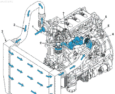 1、至渦輪增壓器進(jìn)氣口, 2、至空空中冷器的增壓后空氣,3、空空中冷器,4、進(jìn)氣管接頭,5、進(jìn)氣加熱器,6、進(jìn)氣歧管,7、缸蓋進(jìn)氣口,8、進(jìn)氣門(mén),