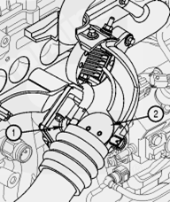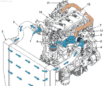 1至渦輪增壓器進(jìn)氣口, 2至空空中冷器的增壓后空氣,3空空中冷器,4節氣門(mén)執行器,5進(jìn)氣管接頭,6進(jìn)氣加熱器,7進(jìn)氣歧管,8缸蓋進(jìn)氣口,9進(jìn)氣門(mén),10EGR 冷卻器,11EGR 閥,12EGR 跨接管,13至進(jìn)氣歧管的排氣,
