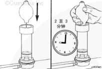 將橡皮球尖端插入測試儀的頂部孔中,擠壓橡皮球 2 到 3 分鐘,通過(guò)測試液吸出散熱器中的空氣。