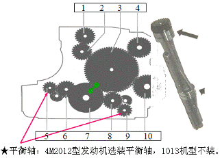 1.調速器驅動(dòng)齒輪,2.惰輪,3.凸輪軸齒輪,4.液壓泵齒輪,5.平衡軸齒輪,6.惰輪,7.曲軸齒輪,8.惰輪,9.平衡軸齒輪,10.壓縮機齒輪,