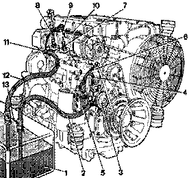 1.油箱,2.通柴油泵的油路,3.柴油泵,4.通柴油濾清器的油器,5.柴油濾清器,6.通噴油泵的油路,7.噴油泵,8.通噴油器的油路,9.噴油器,10.回油管,11帶壓力控制閥的油管螺栓,12.回油箱的油路,13.這個(gè)距離盡可能的大