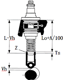 x+y:  缸體中安裝平面到挺柱的高度與標準高度之差。墊片厚度Ts的計算公式   Ts=(L-Vh)-(Lo+A/100) 缸體中安裝平面到挺柱的高度與標準高度Le之差。L值即為L(cháng)=Le+x+y。只更換高壓泵,需知道提前角和A值,根據公式即可得出墊片厚度Ts。Ts=Ek-(Lo+A/100)確定與噴油泵正時(shí)相對應(缸)的活塞上止點(diǎn);
