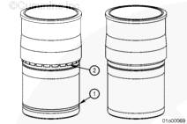 通過(guò)康明斯ISX15 CM2250發(fā)動(dòng)機缸套下部外徑上加工出的條帶 (1) 可以輕易識別出工廠(chǎng)墊片調整缸套。安裝缸套后,同樣可以看到此條帶。這些缸套在中間限位座合區域還包含有固定式硬化黃銅墊片 (2)。