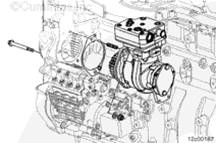將康明斯ISX15 CM2250發(fā)動(dòng)機空氣壓縮機安裝托架和四條螺釘裝到空氣壓縮機下面的缸體上。開(kāi)始擰緊全部四條螺釘。