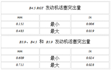 如果康明斯B3.9、B4.5、B4.5 RGT 和 B5.9 發(fā)動(dòng)機活塞突出量不符合技術(shù)規范,核實(shí)是否安裝了正確的零件,和/或缸體燃燒面是否機加工不當。參考步驟 001-026。