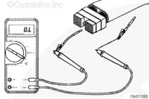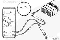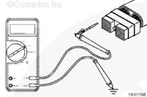 調整萬(wàn)用表以便測量電阻。然后將一根測試導線(xiàn)插入 OEM 線(xiàn)束接頭的離合器踏板位置開(kāi)關(guān)信號觸針。將另一根測試導線(xiàn)插入康明斯離合器踏板位置開(kāi)關(guān)回路觸針。將鱷魚(yú)夾與萬(wàn)用表表筆相連。