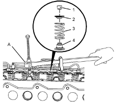 b.使用工具(A),壓縮Perkins1106A/C發(fā)動(dòng)機氣門(mén)彈簧(3)并使氣門(mén)稍稍開(kāi)啟。