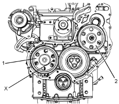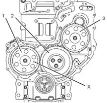 4將工具(B)穿過(guò)Perkins1106A/C發(fā)動(dòng)機凸輪軸齒輪(1)的孔(X)安裝到前Perkins1106A/C發(fā)動(dòng)機機殼體中。使用工具(B)將Perkins1106A/C發(fā)動(dòng)機凸輪軸鎖定到位。