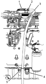 3從Perkins1106A/C發(fā)動(dòng)機氣門(mén)機構蓋(1)和Perkins1106A/C發(fā)動(dòng)機曲軸箱呼吸器的濾清器座(5)上拆下軟管(3)。