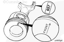 將康明斯ISB5.9 G CM2180發(fā)動(dòng)機活塞和連桿總成裝入缸孔,活塞上的前標記朝向缸體前部。