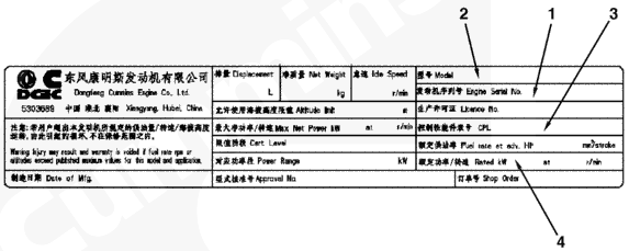 發(fā)動(dòng)機銘牌顯示有關(guān)發(fā)動(dòng)機的重要信息。發(fā)動(dòng)機生產(chǎn)序號 (ESN) 和控制零件目錄 (CPL) 提供了服務(wù)和訂購零件所需信息。未經(jīng)康明斯公司批準不得擅自變更發(fā)動(dòng)機銘牌。
