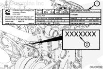 注: 如果發(fā)動(dòng)機銘牌 (1) 不清晰,可以在發(fā)動(dòng)機缸體上的機油冷卻器殼體頂部找到發(fā)動(dòng)機生產(chǎn)序號 (2)。附加發(fā)動(dòng)機信息可以在電子控制模塊 (ECM) 銘牌上找到。