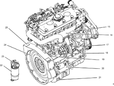 (21)機油排放塞(22)燃油粗濾器(23)充油泵(24)飛輪(25)飛輪殼體