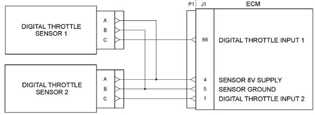 數字節氣門(mén)位置傳感器由+8VDC從ECM。電源電壓來(lái)自的j1:4終端”一個(gè)“數字油門(mén)位置傳感器連接器。