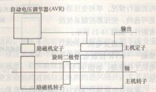 同步發(fā)電機一般由自動(dòng)電壓調節器(AVR),勵磁發(fā)電機,旋轉整流器,主發(fā)電機幾個(gè)部分組成。同步發(fā)電機的構造原理圖如下所示。