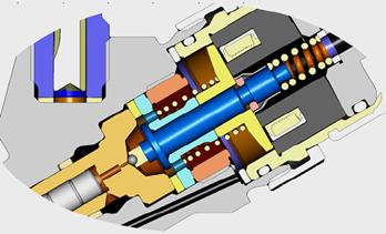該閥與進(jìn)油計量比例閥油路并聯(lián)在一起,能使進(jìn)油計量比例閥的入口處的燃油壓力保持恒定——這是保證系統能正常運行的先決條件。同時(shí)在正常工作時(shí)通過(guò)它增大進(jìn)入CP1H高壓泵的潤滑和冷卻油量。